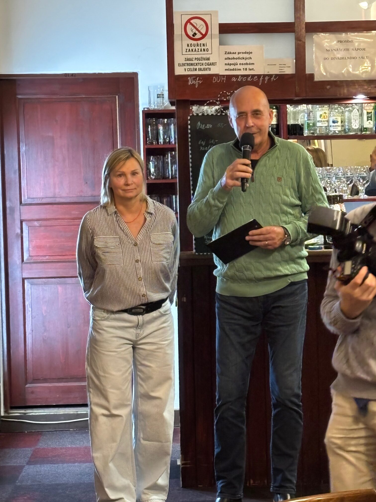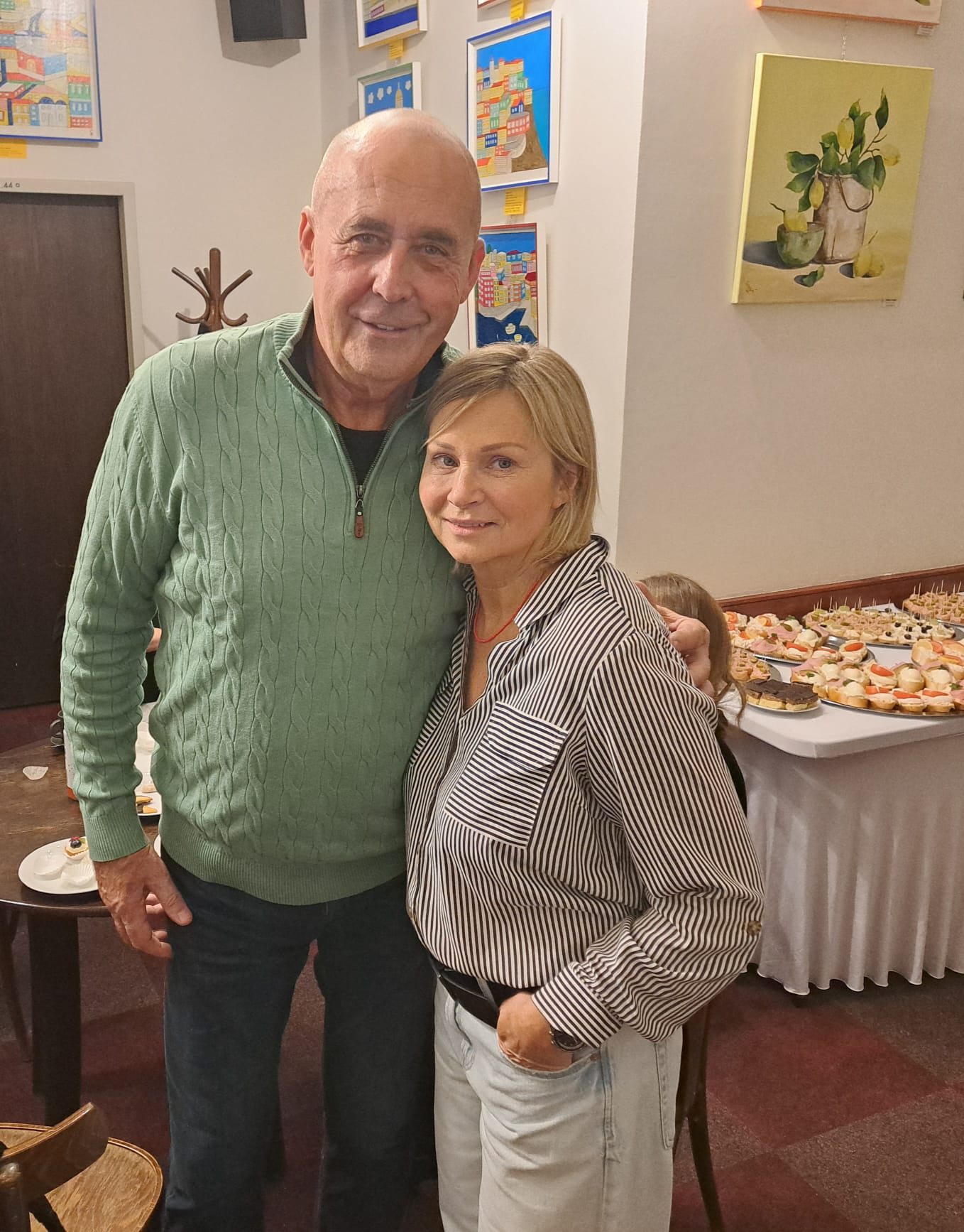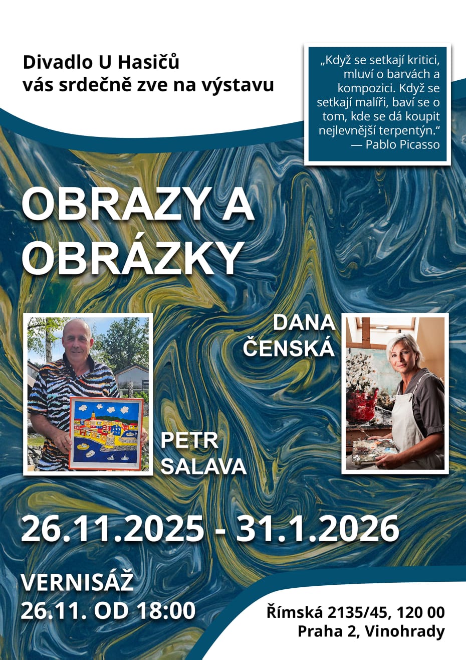 Ve středu 26.11.2026 se do posledního místa naplnil divadelní klub U Hasičů, a to proto, že se tam konala vernisáž výstavy obrazů a obrázků Dany Čenské a Petra Salavy. Moderaci si vzal na starost Petr Salava a přítomné v úvodu pozdravili lektorka Jana Vlková, výtvarník Karel Štědrý ml. a bavič Milan Pitkin. Pak už se rozproudila zábava a také tvorba řady selfíček a fotografií. Danu Čenskou přišel podpořit její manžel Jan, dále dorazili herci Adéla Gondíková a Roman Skamene, dirigent Petr Chromčák, žurnalisté Hana Höschlová a Libor Šprysl a řada dalších vzácných hostů. Obrazy a obrázky se líbily a několik jich už během večera změnilo majitele… Výstava v Divadle U Hasičů potrvá až do konce ledna 2026. FOTO: Matěj Salava a Libor Šprysl.