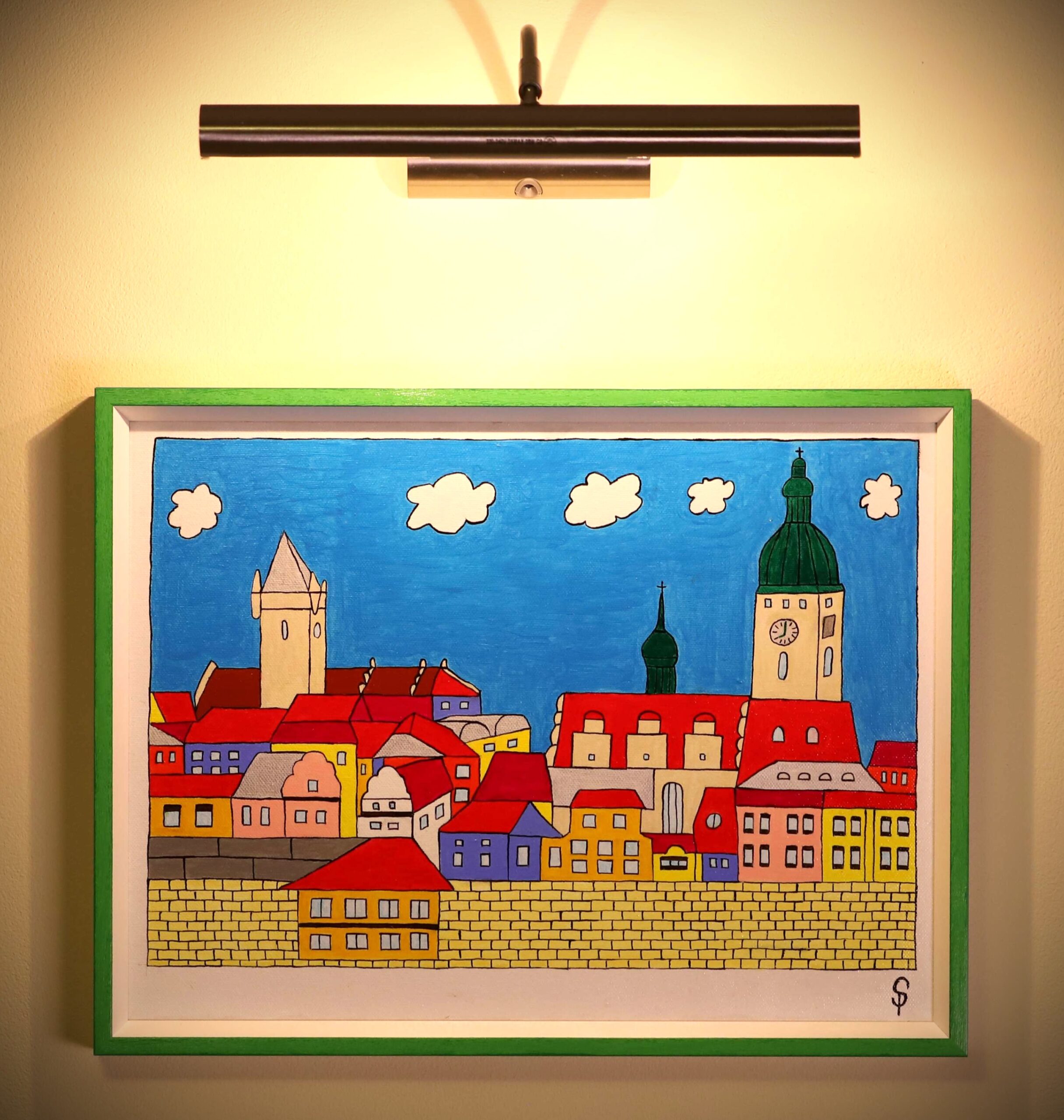 TÁBOR, Česká republika 2026 /Petr Salava – akryl, 30×40 cm, s rámem 32 x 42 cm/. Cena 7.000 Kč včetně zeleného rámu.
