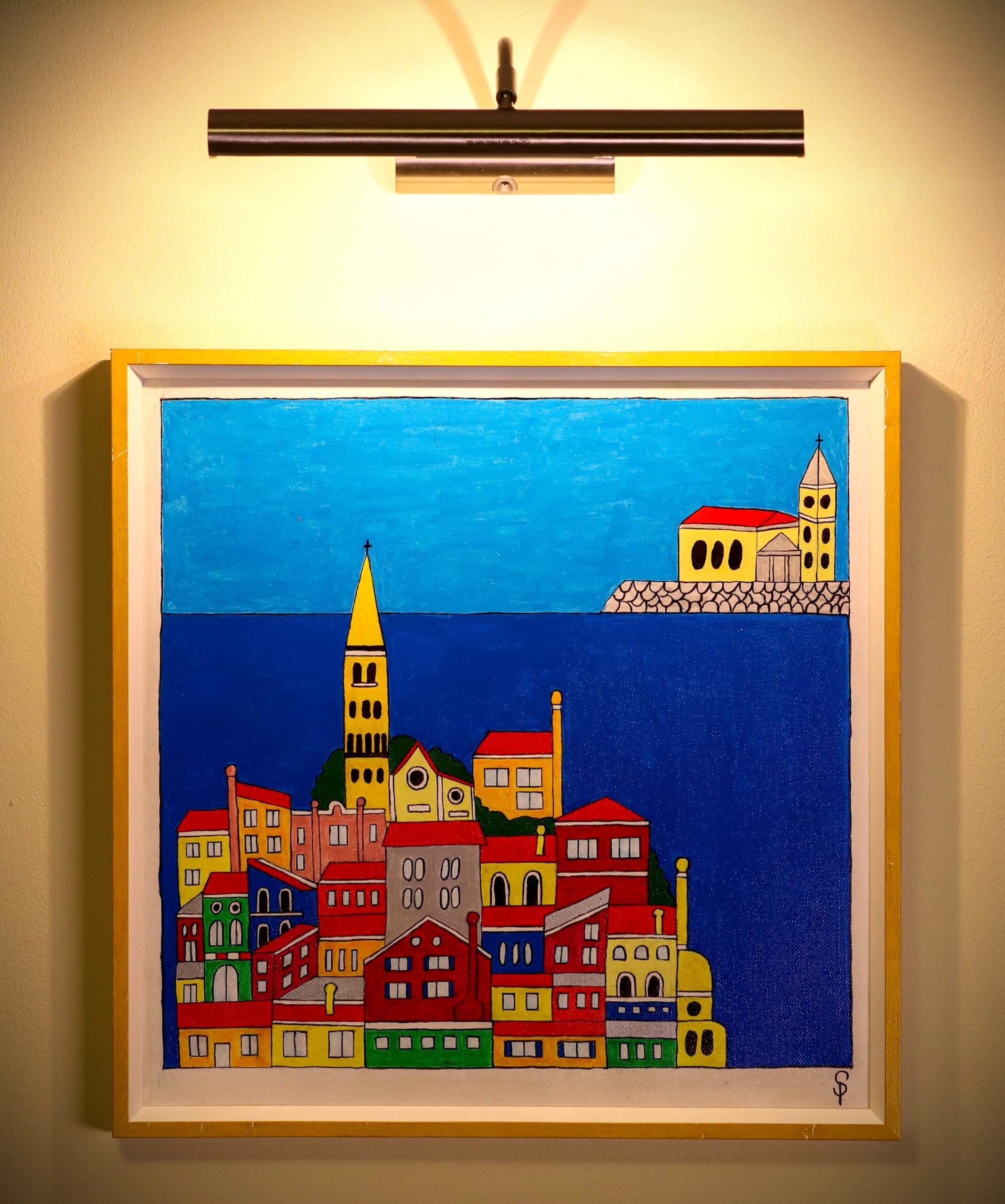 CAORLE, Itálie 2025 /Petr Salava – akryl, 40×40 cm, s rámem 42 x 42 cm/. Cena 6.500 Kč včetně žlutého rámu.