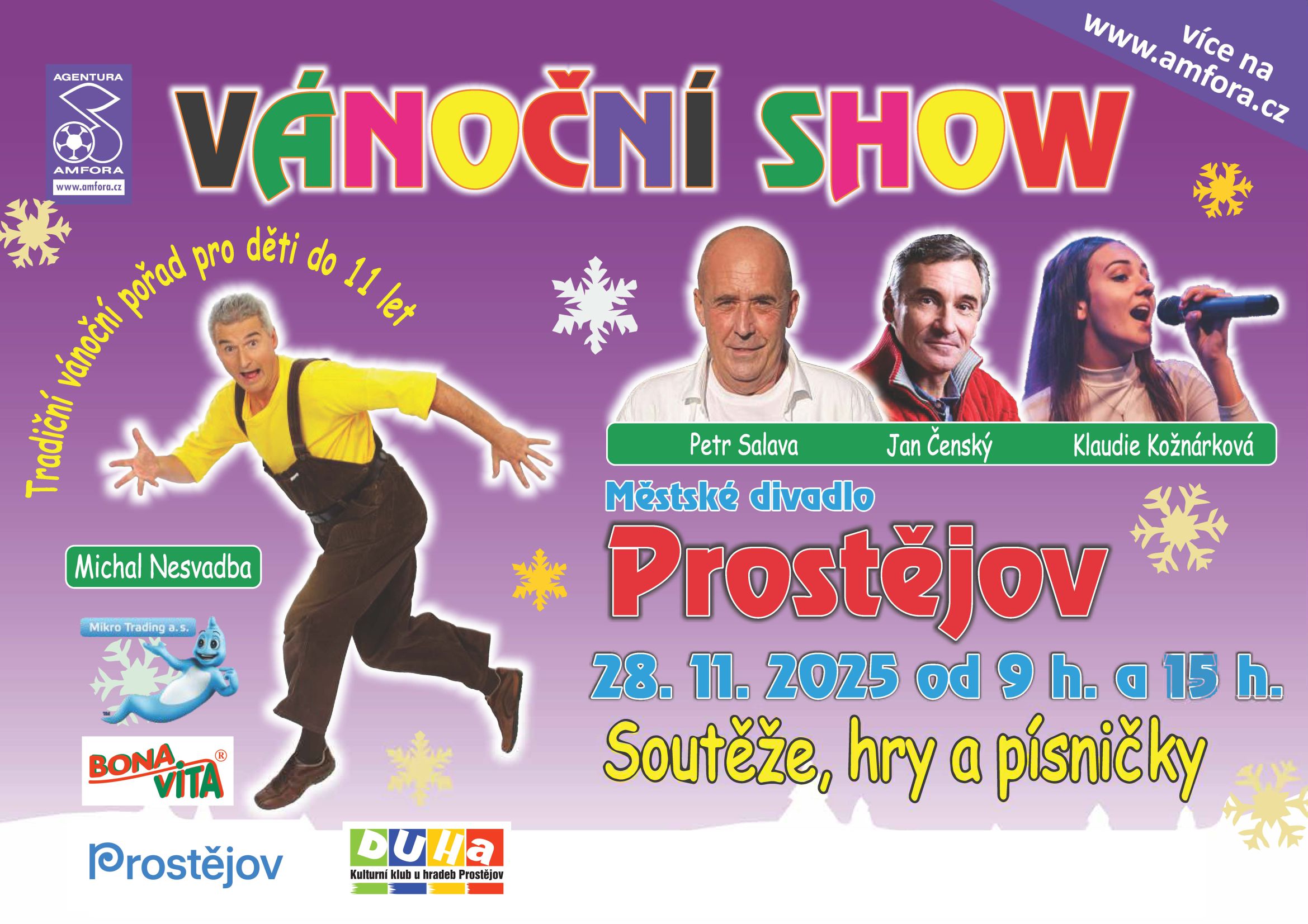 V pátek 28.11.2025 přivítá Městské divadlo v Prostějově legendární Vánoční show. Ve dvou představeních (od 9.00 a 15.00) se představí Jan Čenský, Michal Nesvadba, Petr Salava a Klaudie Kožnárková. Bude se soutěžit, hrát a zpívat, ostatně jako během předchozích 645 představení a nachystány jsou hezké dárky pro soutěžící děti. Vánoční show píše svojí historii už od roku 1991.