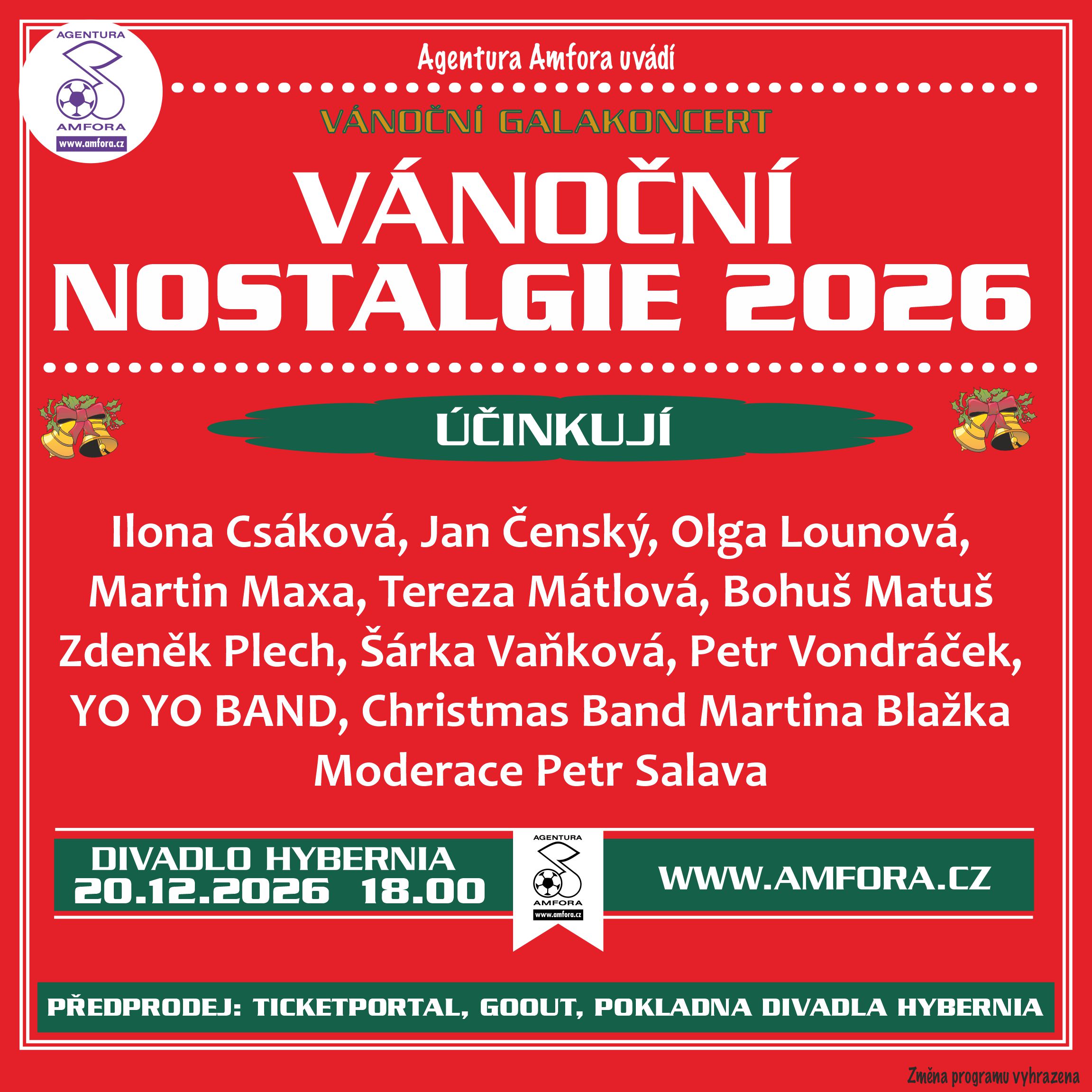 Jako vždy je rok předem připraven další galakoncert Vánoční nostalgie a to už 16. ročník. Tentokrát se uskuteční v neděli 20.12.2026 od 18 hodin v Divadle Hybernia. Speciálně sestavované hudební těleso Christmas Band povede Martin Blažek a bude složeno z nejlepších českých muzikantů. Připojí se i sbor Aleny Rabové. Představí se celkem 10 sólistů. Budou to: Ilona Csáková, Jan Čenský, Olga Lounová, Martin Maxa, Tereza Mátlová, Bohuš Matuš, Zdeněk Plech, Šárka Vaňková, Petr Vondráček a YO YO BAND. Na řadu tak přijdou opět české i světové vánoční písně a k tomu i nostalgické hudební vzpomínky. Moderace: Petr Salava. Délka pořadu 170 minut vč. 20 min. přestávky. Změna programu vyhrazena.