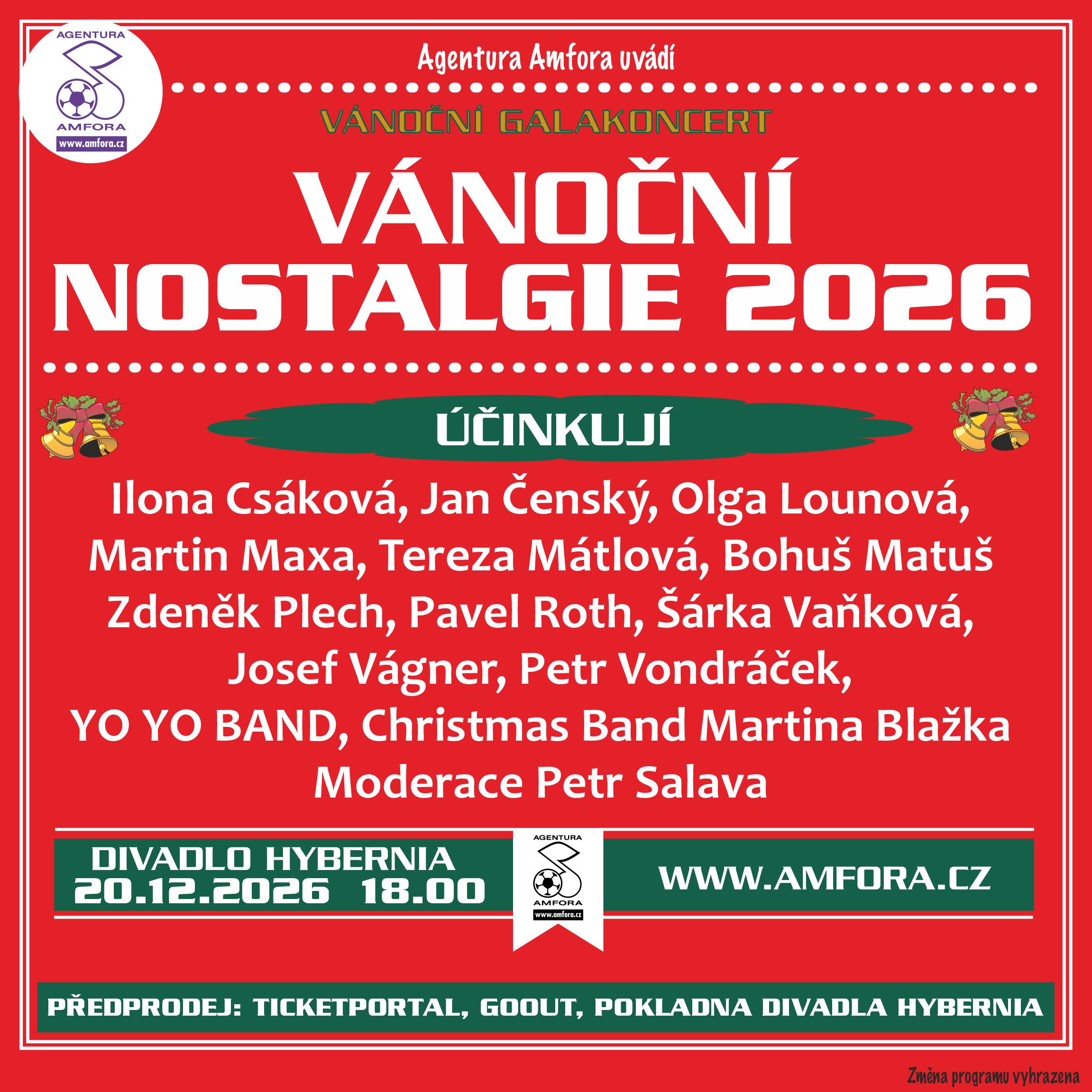 Jako vždy je rok předem připraven další galakoncert Vánoční nostalgie a to už 16. ročník. Tentokrát se uskuteční v neděli 20.12.2026 od 18 hodin v Divadle Hybernia. Speciálně sestavované hudební těleso Christmas Band povede Martin Blažek a bude složeno z nejlepších českých muzikantů. Připojí se i sbor Aleny Rabové. Představí se celkem 12 sólistů. Budou to: Ilona Csáková, Jan Čenský, Olga Lounová, Martin Maxa, Tereza Mátlová, Bohuš Matuš, Zdeněk Plech, Pavel Roth, Šárka Vaňková, Josef Vágner, Petr Vondráček a YO YO BAND. Na řadu tak přijdou opět české i světové vánoční písně a k tomu i nostalgické hudební vzpomínky. Moderace: Petr Salava. Délka pořadu 170 minut vč. 20 min. přestávky. Změna programu vyhrazena.