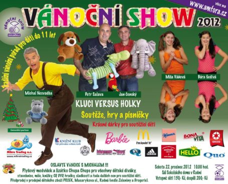 V sobotu 22.12. 2012 navštíví protagonisté turné Vánoční show i Sokolský sál v Rudné. Vstupenky je možné zakoupit již nyní v dětském obchodě PRCEK, Masarykova ul. v Rudné (vedle zeleniny). Vstupné pro děti do 11ti let 150 Kč, dospělí 200 Kč.